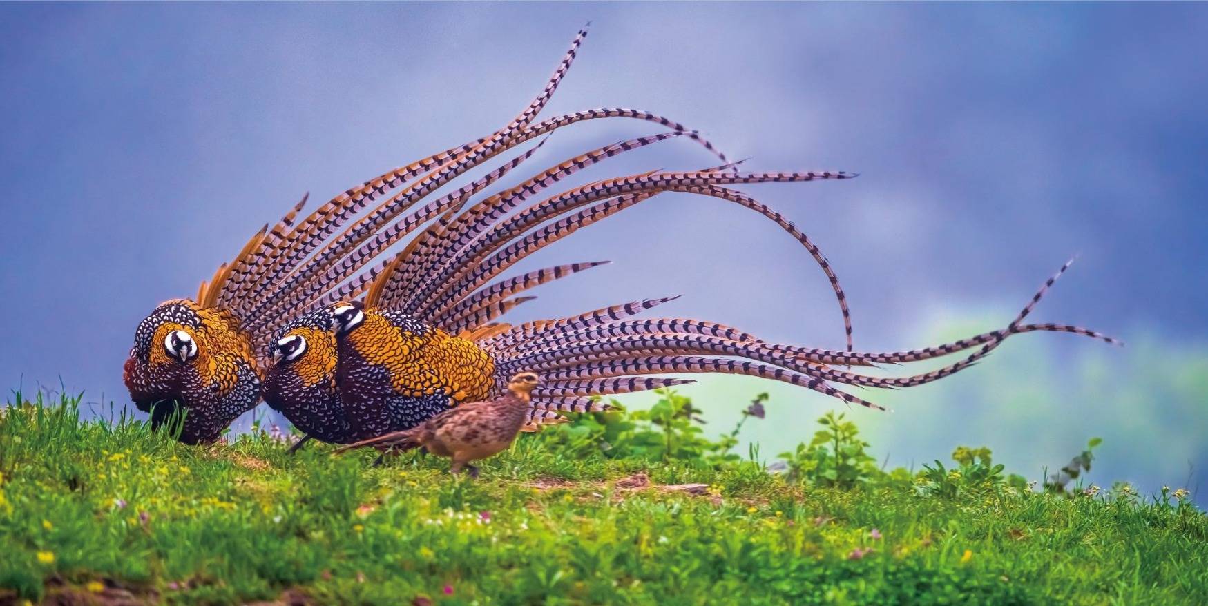 过了一会儿,人群中出现窸窸窣窣的说话声——“白冠长尾雉三兄弟”迈着雄赳赳气昂昂的步伐出场了。大家赶紧转动镜头、对焦拍摄。在一阵快门声中,三兄弟开始表演,振翅、飞跃、互相追逐,忙得不亦乐乎。